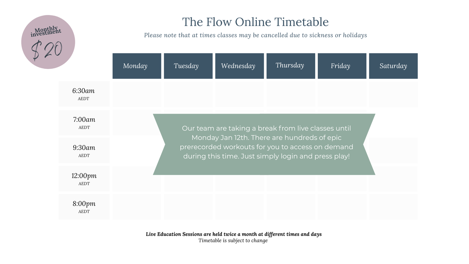 As always, modifications will be given, however this class is best suited to those who have a good foundation of movement and breathing patterns through previous experience and/or have completed our Core and Floor Restore AND Strengthen programs.